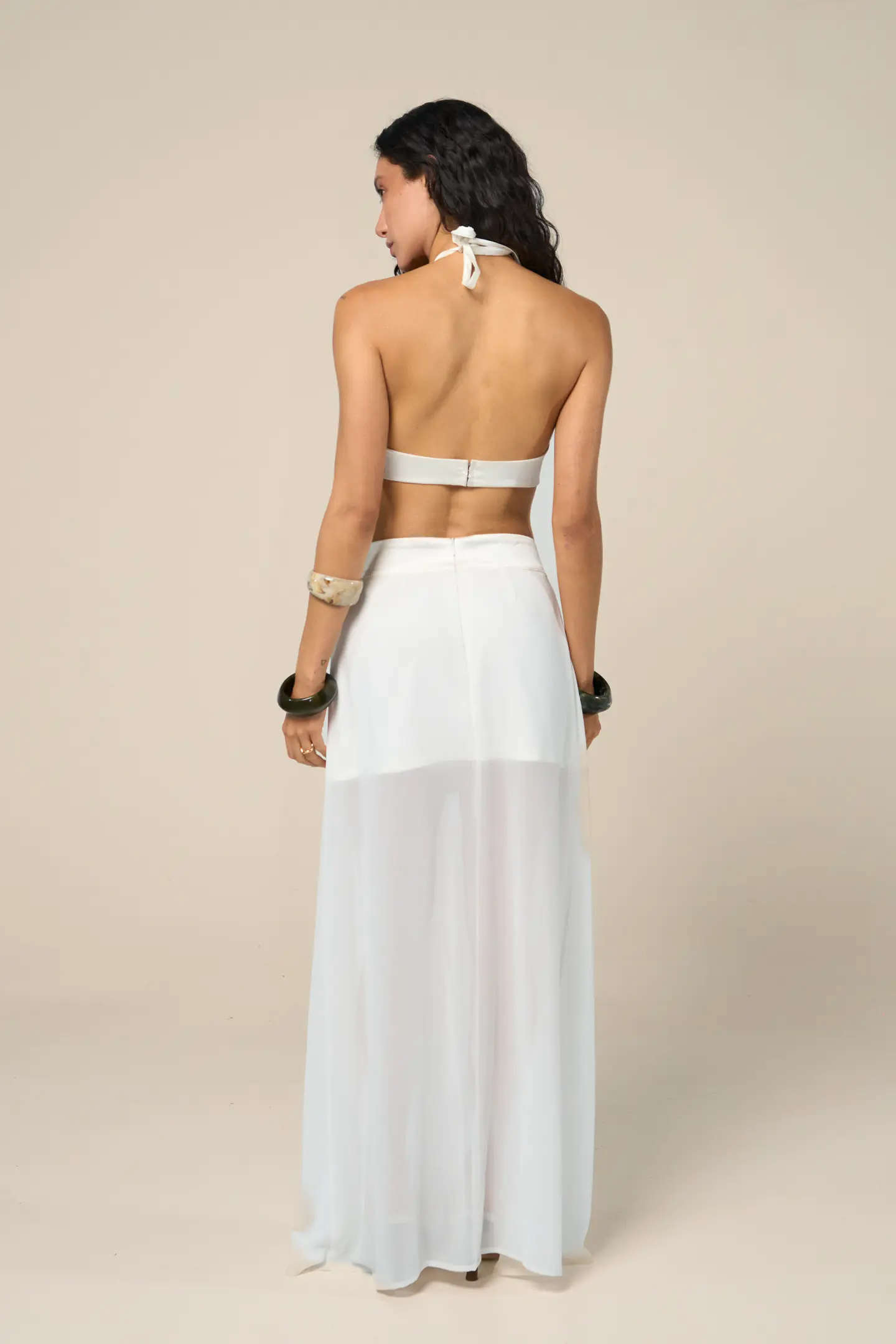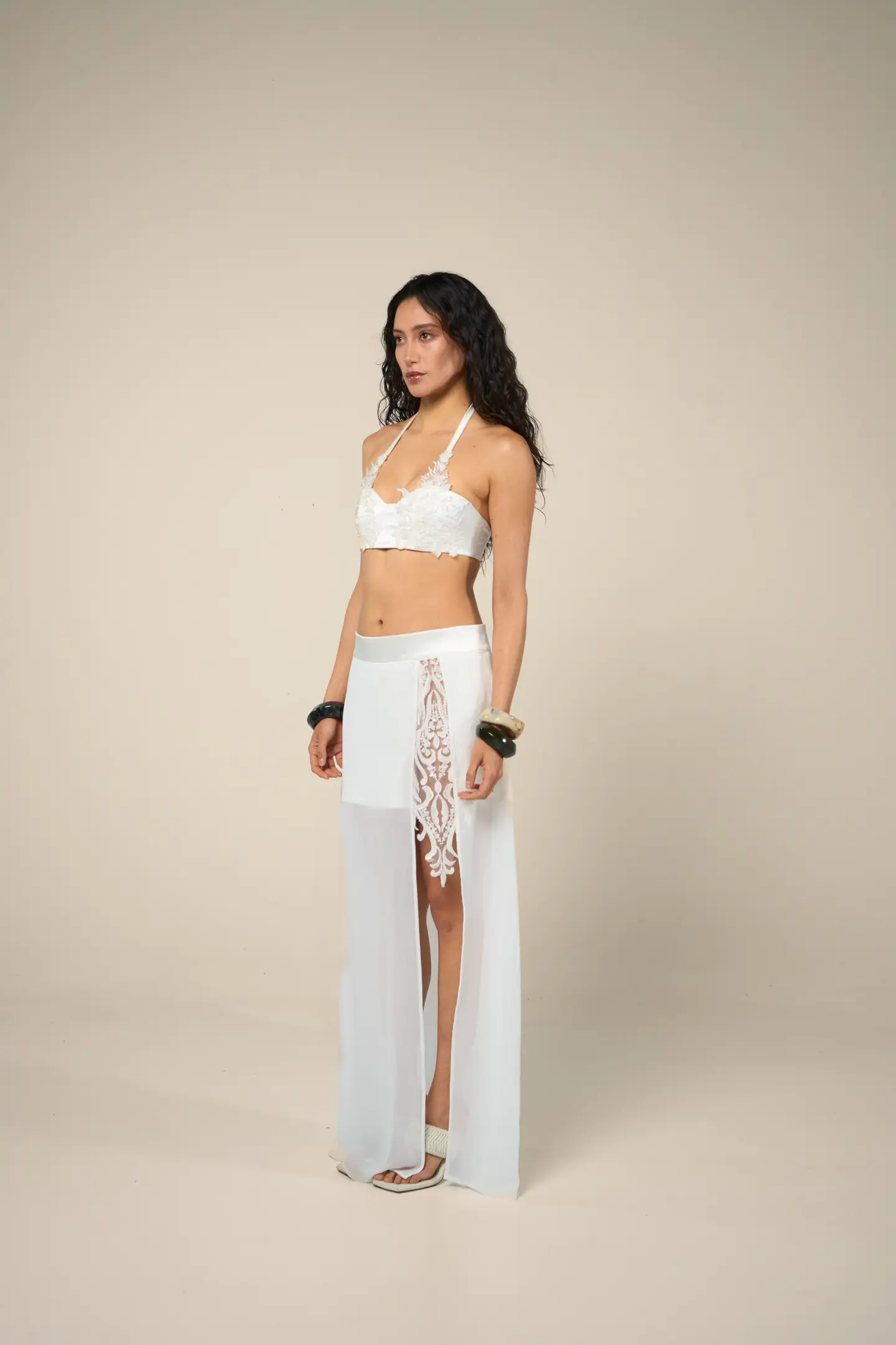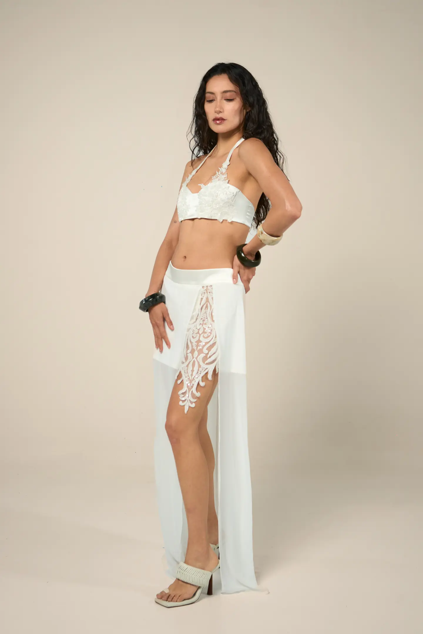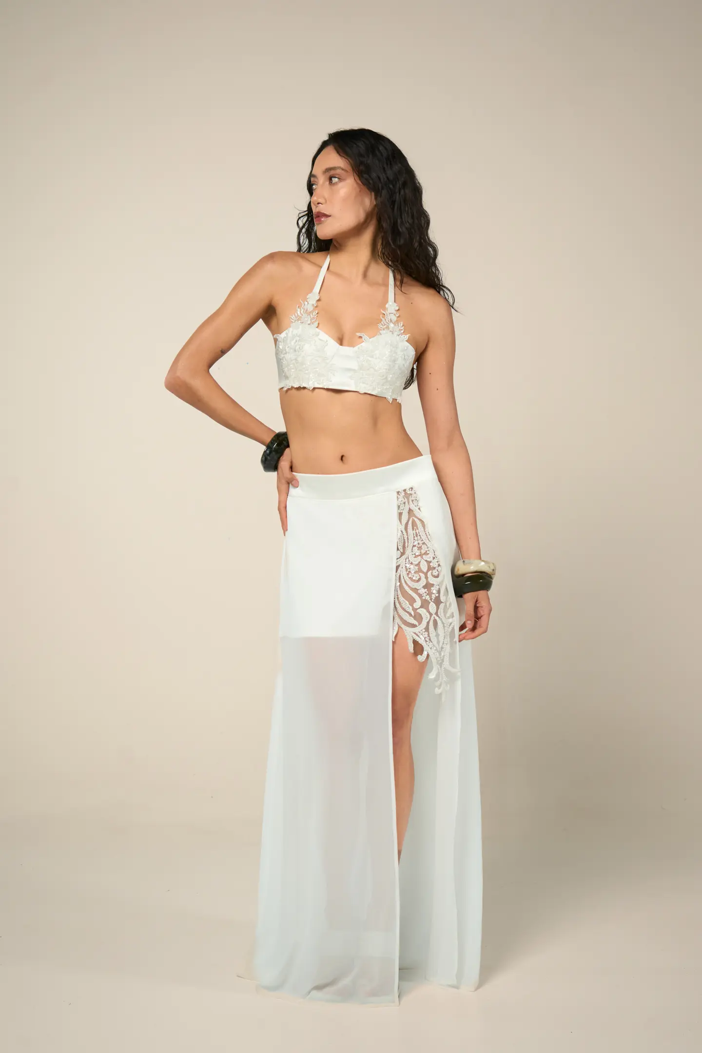 A-line long skirt with a soft chiffon overlay and high slit. Satin base layer features a beaded lace panel along the leg, peeking through the sheer outer layer. Invisible side zip. Designed to pair perfectly with our Opaline bralette.
