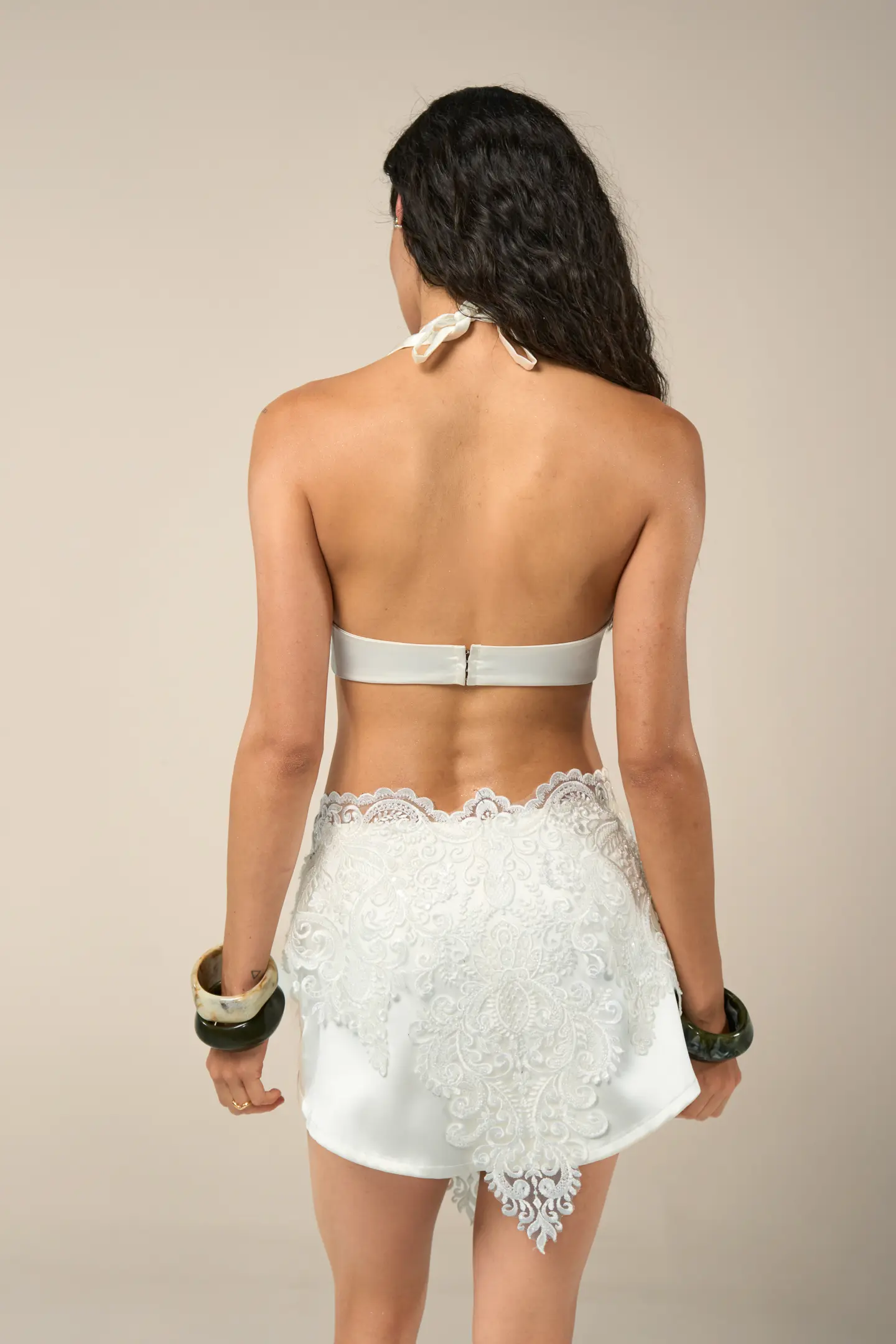 Paired with a matching low-rise mini skirt. The floral lace is lightly lined in chiffon, offering transparency with light coverage. Finished with scalloped edges, it’s a warm-toned, easy statement look. Designed to pair perfectly with our Chrysalis Robe in orange.
